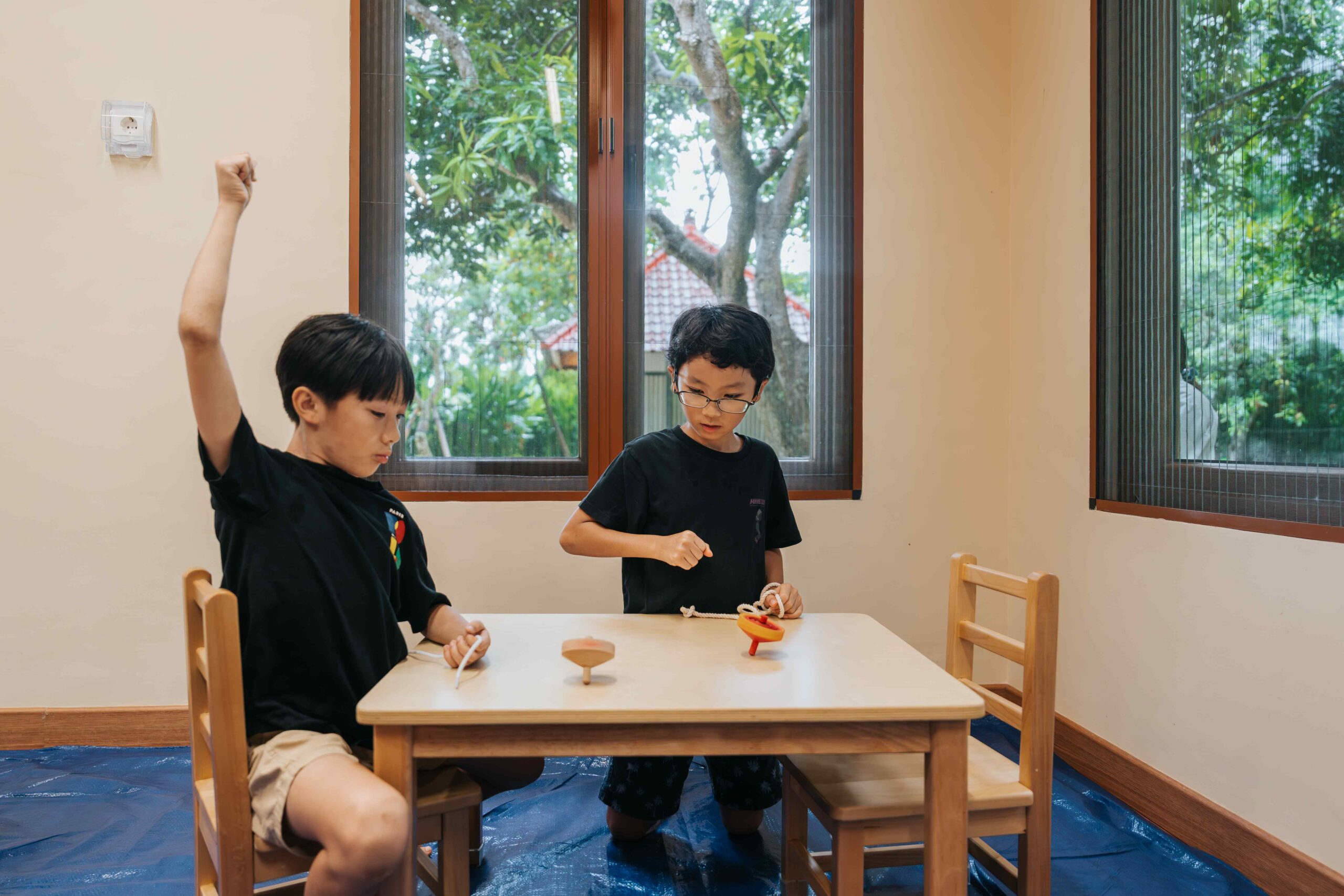 普段は授業の時間帯が別で、あまり顔を合わせることのない子ども同士もすぐ友達になって、仲良くコマで遊びました。